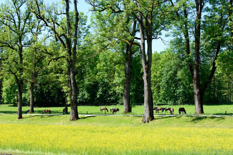 Keywords: tree lined avenue avenue trees away nature meadow pasture horses green spring