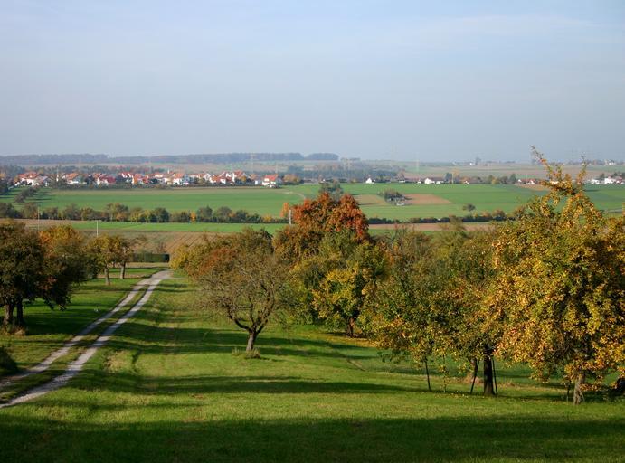 Keywords: tree orchard scattered fruit trees nature landscape sky meadow autumn village outlook place homes outskirts edge of town autumn mood colorful away southern germany baden württemberg harvest fruit picking fruit tree meadow fruit trees