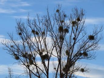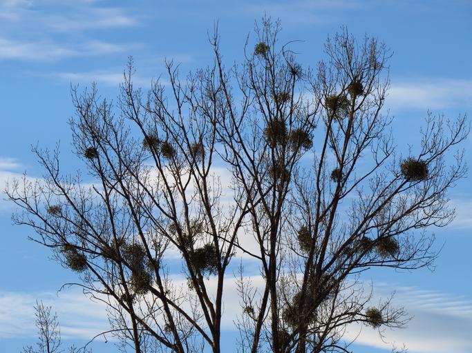 Keywords: tree poplar white poplar silhouette black mistletoe viscum sandalwood crop sky blue clear sunny hell warm beautiful clouds federwolke cirrus branches aesthetic crown parasite
