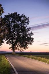 Keywords: tree road sunset nature lichtspiel colorful afterglow away asphalt landscape silhouette the curve of road atmosphere mood