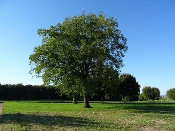 Keywords: tree sky blue clear partly cloudy green forest nature field crown summer shadow stubble grass log landscape meadow green leaves