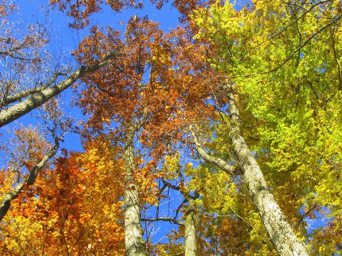 Keywords: tree sky leaves blue sky landscape green red yellow autumn forest trunk branch sunny