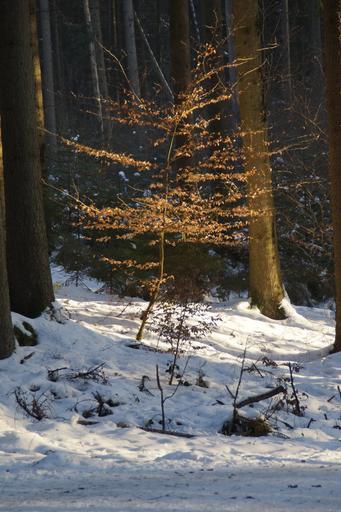 Keywords: tree small forest glade illuminated lit up winter wintry winter forest landscape nature snowy snow