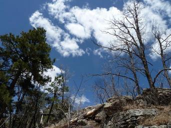 Keywords: trees rocks sky clouds white fluffy blue sky flora wooden woody perennials landscape scenic scenery outdoors hlls mountains stones rocky bright sunny day
