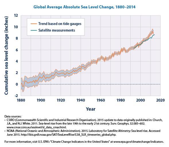 Keywords: Trends in global average absolute sea level, 1880-2013.png sea level from 1880 to 2013 From the public domain source the US EPA 2014 This figure shows average absolute sea level change which refers to the height of the ocean surface regardless of whether nearby land is rising or falling Satellite data are based solely on measured sea level while the long-term tide gauge data include a small correction factor because the size and shape of the oceans are changing slowly over time The shaded band shows the likely range of values based on the number of measurements collected and the precision of the methods used 2014-05 http //www epa gov/climatechange/science/indicators/oceans/sea-level html US EPA other versions PD-USGov Uploaded with UploadWizard Global warming graphs Sea level statistics |