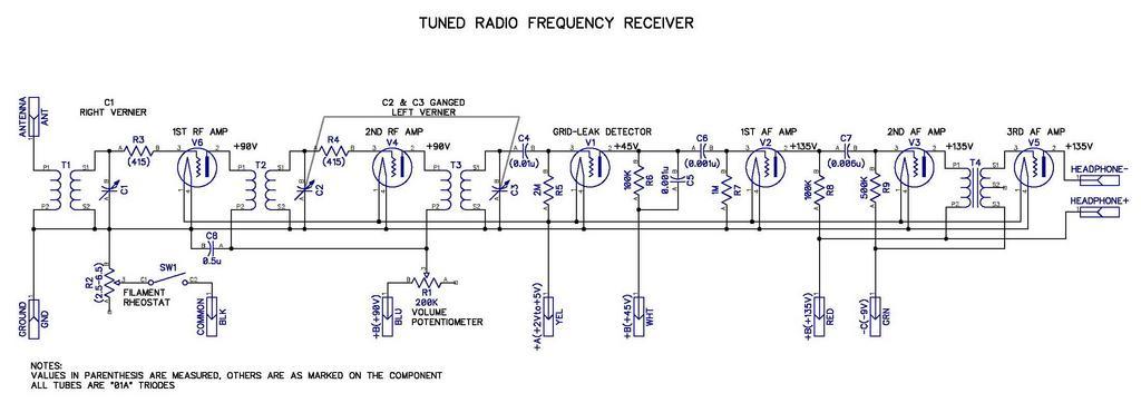 Keywords: TRF Schematic.jpg en Schematic of a Typical TRF Radio Six Tube Design using Triode Tubes “ Two Radio Frequency Amplifiers One Grid-Leak Detector Three Class ˜A ™ Audio Amplifiers own Sweidman 2009-04-15 Tuned radio frequency circuits