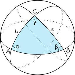 Keywords: Triangle sphérique.svg Triangle sphérique avec trois angles aux sommets et longueur des côtés Own 2008-02-14 Herve1729 public domain Spherical triangles