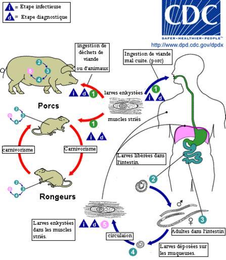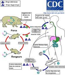 | Keywords: Trichinella LifeCycle(French version).GIF Trichinellosis Trichinella spiralis T pseudospiralis T nativa T nelsoni T britovi Traduction en français de l ™image suivante Trichinella_LifeCycle GIF Life cycle of Trichinella spp Trichinellosis is acquired by ingesting meat containing cysts encysted larvae of Trichinella After exposure to gastric acid and pepsin the larvae are released from the cysts and invade the small bowel mucosa where they develop into adult worms female 2 2 mm in length males 1 2 mm; life span in the small bowel 4 weeks After 1 week the females release larvae that migrate to the striated muscles where they encyst Trichinella pseudospiralis however does not encyst Encystment is completed in 4 to 5 weeks and the encysted larvae may remain viable for several years Ingestion of the encysted larvae perpetuates the cycle Rats and rodents are primarily responsible for maintaining the endemicity of this infection Carnivorous/omnivorous animals such as pigs or bears feed on infected rodents or meat from other animals Different animal hosts are implicated in the life cycle of the different species of Trichinella Humans are accidentally infected when eating improperly processed meat of these carnivorous animals or eating food contaminated with such meat http //www dpd cdc gov/dpdx/images/ParasiteImages/S-Z/Trichinellosis/Trichinella_LifeCycle gif PD-USGov Trichinella life cycle biology PD-USGov CDC lifecycles Trichinella life cycle |