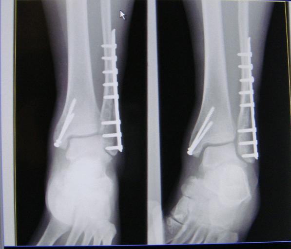 Keywords: TrimalleolarFractureRepair.jpg en Surgical repair of a trimalleolar fracture of the left leg female age 43 own R SUNSET 2009-09-17 X-rays of internal fixation X-rays of foot and ankle fractures