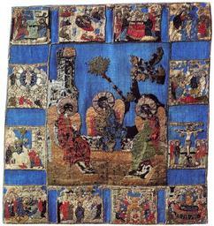 Keywords: Trinity (Sergiev Posad, 15th c).jpg Т оица с п аздниками Суда ь 2-я половина XV в ате иал Камка шелковые золотные и се еб яные нити есто х анения Се гиево-Посадский госуда ственный исто ико-художественный музей-заповедник П оисхождение П оисходит из Т оице-Се гиевой лав ы Разме 55 х 51 Сох анность и естав ация Изоб ажения п и естав ации 1951 г пе еложены на синюю к ашенину Описание а с еднике пелены изоб ажена ветхозаветная Т оица По каймам све ху слева нап аво 1 Благовещение 2 Рождество 3 С етение 4 К ещение 5 П еоб ажение 6 Воск ешение Лаза я 7 Вход в Ие усалим 8 Распятие 9 Сошествие во ад 10 Вознесение 11 Сошествие святого духа на апостолов 12 Успение Богомате и Все шито азноцветными шелками в аскол имбы конту ы складки одежд надписи и д угие детали - золотом Пе воначальные фоны - ко ичневая камка на с еднике и песочная на каймах - не сох анились и видны лишь в местах ут ат шитья http //lib pstgu ru/icons/index2 php option com_content view article id 1292433285 3C 2-я половина XV в anonymous Embroidery in Museum of Sergiev Posad 15th-century Russian orthodox embroidery Files uploaded by Shakko from various sources Old Testament Trinity PD-old-100 |