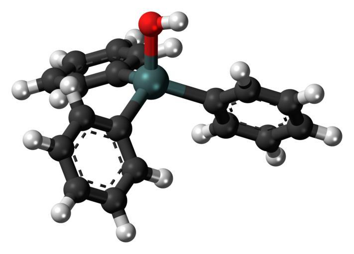 Keywords: Triphenyltin-hydroxide-3D-balls.png Ball-and-stick model of the triphenyltin hydroxide molecule an organotin compound Colour code 505050 Carbon C black<br> F0F0F0 Hydrogen H white<br> F51E1E Oxygen O red<br> 5A8282 Tin Sn blue-grey<br> 2011-05-29 own DS Visualizer Jynto talk Space-filling version cc-zero Phenyltin compounds Ball-and-stick models Phenyl compounds Oxygen-hydrogen compounds Images by Jynto |
