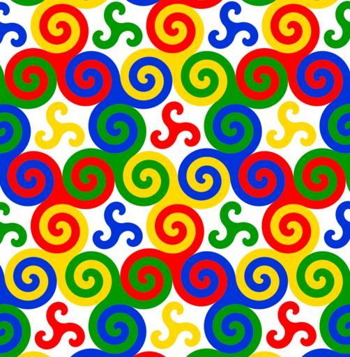 | Keywords: Triskele-quasi-tesselation.svg Ornamental four-colored design of interlocked spiral triskelion symbols -- a pattern which is a partial tesselation of the plane Includes large triple spiral triskelions based on three filled mathematical Archimedean spirals i e spiral triskelions of 11/6 turns interlocked with each other and also with small 1-turn triskelions filling the quasi-hexagonal gaps between them own For a single triple-spiral triskelion symbol similar to those interlocked in this graphic and the Postscript vector source code which generates it see Image Triskele-Symbol-spiral-five-thirds-turns svg 2007 AnonMoos Triple spiral Archimedean spirals Geometric patterns Generated by PostScript Computer generated textures |