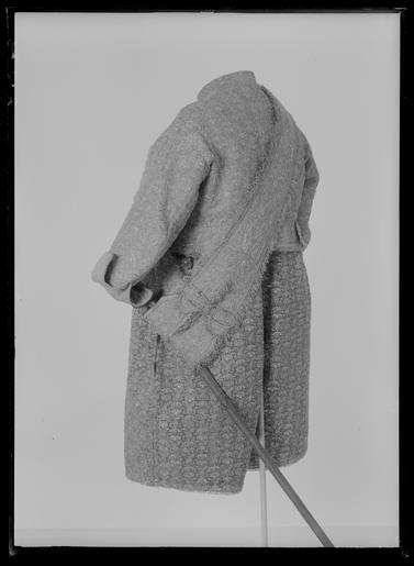 | Keywords: Tröja av guldlamé helt täckt av guldbroderi - Livrustkammaren - 35992.tif LSH artwork sv Förmodligen tillverkad i Frankrike Buren av Karl X Gustav 1622-1660 i samband med kröningen <br/>I 1671 års inventarium står En Klädningh som är gjord till H K Maij tz Lÿcklige Cröningh och sägs omfatta följande plagg nämligen kappa tröja byxor knäband skorosor och handskar I 1654 års klädkammarräkning förtecknas dräkten under nr 3 på följande sätt 1 klädning och kappa av filemort gul oskuren sammet helt broderad med guld och med 140 diamantknappar till tröjan och byxorna 1 par strumpeband och skoband av rik guldbrokad helt broderade med guld 1 par underbyxor av incarnadie rosa taft och silkesstrumpor av samma färg 1 guldbroderat med guld och stofferade med guldbrokad 1 panasch plym av couleur de feu röda filemort och aurorafärgade fjädrar 1 par förgyllda sporrar och 1 värja med förgyllt fäste <br/>Nu finns endast tröjan och byxorna i behåll i sitt skick som dräkt medan den stora rundskurna kappan inte längre omtalas i inventarierna efter 1691 1704 års inv säger inget om kappan men den finns förvandlad till mässhake och altarbrun i Riddarsholmskyrkan Skänkta dit den 1 april 1705 av Riksänkedrottningen Hedvig Eleonora Mässhaken Gjord av tjock gul rips OBS Fel Enl Sveriges kyrkor skall vara sammet oskuren ett material som skiljer sig från såväl tröjans som byxornas Broderad med mönster i guld på samma sätt som på tröjan och byxorna Mönsterrapport 8 x 8 cm Såväl fram- som bakstycket består av 2 hopsydda våder av c a 40 cm bredd max längd ca 90 cm Drottningens namnchiffer HRS samt ANNO 1705 har broderats på respektive fram- och baksidorna <br/>Tröjan är sydd av vad man med ett modernt namn skulle beteckna som guldlamé som helt täckts med guldbroderi Den är av s k innocenttyp d v s ett relativt kort livplagg med planschetter inlagda som styvnad i framstyckenas snibbiga främre hörn försett med 10 små skört ståndkrage och relativt korta ärmar med öppna sömmar framtill På vänster framstycke har 17 st 2 cm knapphål sytts med jämna mellanrum ca 1 cm från kanten Vad man bör lägga märke till är att tröjan sytts av ett större antal stycken som skarvats samman Förmodligen har plagget antingen redan varit i tidigare bruk före kröningen 1654 och blivit något förtrångt eller också har man misslyckats med passformen vid tillfället i fråga och har varit tvungen att göra en del ändringar Möjligheten att tröjan kan ha förändrats vid något senare tillfälle kan man inte heller bortse ifrån <br/>Bottenmaterialet består nämligen av två skilda lamétyger ett något gulare i de smalare skarvarna och f ö ett något rödare det egentliga materialet Tröjan är huvudsakligen skuren i 2 framstycken 2 ryggstycken samt 2 ärmstycken till vardera ärmen 10 skört samt krage Man kan alltså visa att framstyckena måste skarvas med remsor av det gulare tyget utefter de raka framkanterna samt även i sidsömmen I halsringningen har en liten kil satts in mellan det vertikala skarvstycket fram och axelsömmen Bakstyckena ha fått var sin vertikala skarv knappt 4 cm bred mitt i ryggen på ömse sidor om mittsömmen Utefter ärmarnas öppna långsidor har vertikala stycken fogats till och nere vid ärmens avslutning har på undersidans stycken en smal horisontell remsa sytts På överärmstycket däremot har en horisontell skarv satts in överst uppe vid ärmringningen Kragen är också uppklippt baktill och försedd med 2 små skarvstycken Det 3 e skörtet på varje sida är eventuellt nysytt ty dess färg förefaller ljusare broderiet är klumpigare och kompositionen annorlunda mot alla de övriga 8 som exempelvis har den lilla blomman nedtill i mitten <br/>Mönstret har i någon mån missuppfattats i de senare sydda styckena så har man t ex lagt krepiner och trådar i båge i stället för att klippa av dem och börja med en ny tråd Ärmarnas nedersta parti mellan 3 5-7 cm är lämnat utan broderi beroende på att det ju skulle vikas till uppslag Ärmarna har inga knappar eller knapphål intill sprunden vid handlederna I midjan sitter på insidan under skörten 8 st små tampar med vardera 2 hål för byxornas hakar Guldlamén har en vådbredd av minst 31 cm utan stad 45x15 tr/cm2 Varje inslag består av gult silke med 2 och 2 smala trinda guldtenar på rätan <br/>Analysresultat <br/>Metalltråd tvinnad med textiltråd huvudbeståndsdelar <br/>Silver xxx<br/>Guld x<br/>Koppar xxx<br/>Zink 0<br/>Det yttäckande läggsömsbroderiet består av kantiljer av trinda tenar och platta lan av olika bredd snodder med silkeskärna omtvinnade med guldlan strängar dragna av trinda tenar av guld eller silver som stansats ut i spiraler eller öglor och manglats platta på halva sidan här benämnda spiral- eller paljett strängar i brist på befintlig terminologi och 2 och 2 tätt liggande strängar med trinda smala guldtenar virade runt ett bredare guldanklätt snöre etc Broderiet är nersytt med gult silke Mönsterraporten är 6 5x6 5 cm Mönstret Ur 2 från varandra utåtböjda palmkvistar som strax nedanför mitten sammanhålles med en uppåtböjd båge växa omväxlande 5- och 8-flikiga icke naturalistiska blommor upp <br/>Analysresultat <br/>Metalltrådsbroderi huvudbeståndsdelar <br/>Silver xxx<br/>Guld xxx<br/>Koppar xxx<br/>Zink 0<br/>Tröjan är garnerad med en 2 3 cm bred knypplad uddspets av guldtråd med 2 inlagda guldlan Mönsterrapporten är c a 2 5 cm Spetsen sitter på bägge främre ytterkanterna knapparna har alltså suttit ovanpå spetsen och fortsätter därifrån omedelbart runt de 2 främre skörten Vidare sitter det spets runt de 3 ytterkanterna av varje skört på axel-och sidsömmarna runt ärmhålen och längs de öppna ärmsömmarna sprunden Den ursprungliga knäppningen finns inte längre kvar diamantknapparna lät änkedrottningen ta ur och använda för annat ändamål Numera knäppes tröjan med h