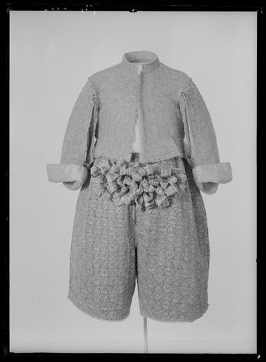 Keywords: Tröja av guldlamé helt täckt av guldbroderi - Livrustkammaren - 53111.tif LSH artwork sv Förmodligen tillverkad i Frankrike Buren av Karl X Gustav 1622-1660 i samband med kröningen <br/>I 1671 års inventarium står En Klädningh som är gjord till H K Maij tz Lÿcklige Cröningh och sägs omfatta följande plagg nämligen kappa tröja byxor knäband skorosor och handskar I 1654 års klädkammarräkning förtecknas dräkten under nr 3 på följande sätt 1 klädning och kappa av filemort gul oskuren sammet helt broderad med guld och med 140 diamantknappar till tröjan och byxorna 1 par strumpeband och skoband av rik guldbrokad helt broderade med guld 1 par underbyxor av incarnadie rosa taft och silkesstrumpor av samma färg 1 guldbroderat med guld och stofferade med guldbrokad 1 panasch plym av couleur de feu röda filemort och aurorafärgade fjädrar 1 par förgyllda sporrar och 1 värja med förgyllt fäste <br/>Nu finns endast tröjan och byxorna i behåll i sitt skick som dräkt medan den stora rundskurna kappan inte längre omtalas i inventarierna efter 1691 1704 års inv säger inget om kappan men den finns förvandlad till mässhake och altarbrun i Riddarsholmskyrkan Skänkta dit den 1 april 1705 av Riksänkedrottningen Hedvig Eleonora Mässhaken Gjord av tjock gul rips OBS Fel Enl Sveriges kyrkor skall vara sammet oskuren ett material som skiljer sig från såväl tröjans som byxornas Broderad med mönster i guld på samma sätt som på tröjan och byxorna Mönsterrapport 8 x 8 cm Såväl fram- som bakstycket består av 2 hopsydda våder av c a 40 cm bredd max längd ca 90 cm Drottningens namnchiffer HRS samt ANNO 1705 har broderats på respektive fram- och baksidorna <br/>Tröjan är sydd av vad man med ett modernt namn skulle beteckna som guldlamé som helt täckts med guldbroderi Den är av s k innocenttyp d v s ett relativt kort livplagg med planschetter inlagda som styvnad i framstyckenas snibbiga främre hörn försett med 10 små skört ståndkrage och relativt korta ärmar med öppna sömmar framtill På vänster framstycke har 17 st 2 cm knapphål sytts med jämna mellanrum ca 1 cm från kanten Vad man bör lägga märke till är att tröjan sytts av ett större antal stycken som skarvats samman Förmodligen har plagget antingen redan varit i tidigare bruk före kröningen 1654 och blivit något förtrångt eller också har man misslyckats med passformen vid tillfället i fråga och har varit tvungen att göra en del ändringar Möjligheten att tröjan kan ha förändrats vid något senare tillfälle kan man inte heller bortse ifrån <br/>Bottenmaterialet består nämligen av två skilda lamétyger ett något gulare i de smalare skarvarna och f ö ett något rödare det egentliga materialet Tröjan är huvudsakligen skuren i 2 framstycken 2 ryggstycken samt 2 ärmstycken till vardera ärmen 10 skört samt krage Man kan alltså visa att framstyckena måste skarvas med remsor av det gulare tyget utefter de raka framkanterna samt även i sidsömmen I halsringningen har en liten kil satts in mellan det vertikala skarvstycket fram och axelsömmen Bakstyckena ha fått var sin vertikala skarv knappt 4 cm bred mitt i ryggen på ömse sidor om mittsömmen Utefter ärmarnas öppna långsidor har vertikala stycken fogats till och nere vid ärmens avslutning har på undersidans stycken en smal horisontell remsa sytts På överärmstycket däremot har en horisontell skarv satts in överst uppe vid ärmringningen Kragen är också uppklippt baktill och försedd med 2 små skarvstycken Det 3 e skörtet på varje sida är eventuellt nysytt ty dess färg förefaller ljusare broderiet är klumpigare och kompositionen annorlunda mot alla de övriga 8 som exempelvis har den lilla blomman nedtill i mitten <br/>Mönstret har i någon mån missuppfattats i de senare sydda styckena så har man t ex lagt krepiner och trådar i båge i stället för att klippa av dem och börja med en ny tråd Ärmarnas nedersta parti mellan 3 5-7 cm är lämnat utan broderi beroende på att det ju skulle vikas till uppslag Ärmarna har inga knappar eller knapphål intill sprunden vid handlederna I midjan sitter på insidan under skörten 8 st små tampar med vardera 2 hål för byxornas hakar Guldlamén har en vådbredd av minst 31 cm utan stad 45x15 tr/cm2 Varje inslag består av gult silke med 2 och 2 smala trinda guldtenar på rätan <br/>Analysresultat <br/>Metalltråd tvinnad med textiltråd huvudbeståndsdelar <br/>Silver xxx<br/>Guld x<br/>Koppar xxx<br/>Zink 0<br/>Det yttäckande läggsömsbroderiet består av kantiljer av trinda tenar och platta lan av olika bredd snodder med silkeskärna omtvinnade med guldlan strängar dragna av trinda tenar av guld eller silver som stansats ut i spiraler eller öglor och manglats platta på halva sidan här benämnda spiral- eller paljett strängar i brist på befintlig terminologi och 2 och 2 tätt liggande strängar med trinda smala guldtenar virade runt ett bredare guldanklätt snöre etc Broderiet är nersytt med gult silke Mönsterraporten är 6 5x6 5 cm Mönstret Ur 2 från varandra utåtböjda palmkvistar som strax nedanför mitten sammanhålles med en uppåtböjd båge växa omväxlande 5- och 8-flikiga icke naturalistiska blommor upp <br/>Analysresultat <br/>Metalltrådsbroderi huvudbeståndsdelar <br/>Silver xxx<br/>Guld xxx<br/>Koppar xxx<br/>Zink 0<br/>Tröjan är garnerad med en 2 3 cm bred knypplad uddspets av guldtråd med 2 inlagda guldlan Mönsterrapporten är c a 2 5 cm Spetsen sitter på bägge främre ytterkanterna knapparna har alltså suttit ovanpå spetsen och fortsätter därifrån omedelbart runt de 2 främre skörten Vidare sitter det spets runt de 3 ytterkanterna av varje skört på axel-och sidsömmarna runt ärmhålen och längs de öppna ärmsömmarna sprunden Den ursprungliga knäppningen finns inte längre kvar diamantknapparna lät änkedrottningen ta ur och använda för annat ändamål Numera knäppes tröjan med hys