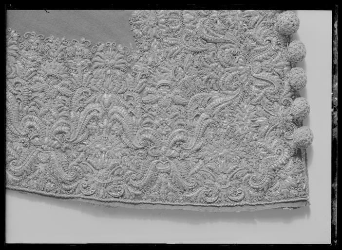 | Keywords: Tröja av mönstrad silverbrokad, ca 1650-1660 - Livrustkammaren - 61640.tif LSH artwork sv Buren av Karl X Gustav 1622-1660 vid kröningen 1654-06-06 okänd tillverkare <br/>Tröja Livplagg av innocenttyp Skuren i 2 lika stora framstycken vars framkanter följer staden 1 helt bakstycke 1 ståndkrage 10 små skört samt 2 svängda stycken för varje ärm Plagget är sytt av rik silverbrokad och har även foder av silverbrokad i annat mönster Tröjan är försedd med mellanfoder av linnelärft 20x19 tr/cm2 och planschetter triangelformade styvnader nedtill i de spetsiga framkanterna Kragen är på insidan fodrad med vitt mönstrat siden av samma sort som återkommer i tröjan till dräkt nr 3401 och har mellanfoder av linnelärft 25x21 tr/cm2 med inlagd styvnad troligen fiskben Vänsterframstycke har 21 knapphål för de bevarade 21 knapparna i höger framstycke Knapphålen är sydda med vitt högertvinnat silke 8 stygn/cm över 1 tråd Knapparna d 1 3 cm är med silverlansomspunnet vitt högertvinnat silke trind kantilj och silverlan Tre stycken likadana knappar sitter i kragen men motsvarande tränsar saknas <br/>Silverbrokaden som utgör tröjans övertyg benämnes rik silverduk Den kan beskrivas på följande sätt Vådbredd minst 50 cm 72x18 tr/cm2 Varp av tunt vitt otvinnat silke De grövre otvinnade vita inslagstrådarna bildar dels botten med silverlan i varje inslag dels blommönster av flotterade trådar med högertvinnade silverlan i varje sådant inslag Stad 1 cm 10 gröna 4 orange 12 gröna 1 vit tråd Mönsterrapport 8 8 x 8 8 cm Mönstret är symmetriskt uppbyggt med halvnaturalistiska blommor sammanhållna i rosettlika arrangemang Ärmarna är avsedda att ha den främre sömmen öppen På de motsatta bakre sömmarna har ärmarna sprund nedtill vid handleden Man har avsett att vika upp ärmensnederkant till uppslag Förutom de 10 trapetsformade skörten sitta i midjan på tröjansinsida 7 st stroppar klädda med foderbrokaden vardera med 2 hål för de 7 silverhakarna ibyxlinningen 4 sitter på den vänstra sidan och 3 på den högra Silverbrokaden som utgörtröjans foder benämnes också i de äldre inventarierna silverduk <br/>Denna har en vådbredd av minst 51 cm c a 70 x 18 á 19 tr/cm2 Mycket tunn och tät varp avvita otvinnade silkestrådar där dessa bildar botteninslag ha de försetts med silverlan pårätan De flotterande mönstertrådarna är däremot endast av vitt silke Ripsvävnad Stad 0 8 cm 12 gröna 4 gulorange 10 gröna 1 tjockare vit tråd - vävnad i tuskaft Mönsterrapport h 7 7 cm b 6 6 cm Det är ett halvnaturalistiskt blomstermönster med enkarakteristisk figur som erinrar om en fjäder Samma silverbrokad återkommer som foder itröjan nr 3389 All garnering och dekor av spetsar har sprättats bort och tröjans foder harskadats upptill Kragen har även brännskada vilket tyder på att den lämnats till utbrännning På kragens insida har man med bläck märkt plagget N 43 en åtgärd somstammar från 1789 original caption Karl X Gustavs kröning < 1654 brocade d1 - dräkt - yttermaterial material silverbrokad - linen - silk Färg vit material siden - silk Färg vit material silke - silver - silver - brocade d1 - dräkt - yttermaterial material silverbrokad LRK Karl X Gustav av Sverige Gallica 1945 Sweden - A Royal Treasury 1988-1989 Slottet brinner 1997 1648 Westfaliska freden 1998 Modelejon 2002 Les arts décoratifs sous Louis XIII 2002 Sweden and Europe 1632-1792 2003-2004 Silver - Makt o prakt i barockens Sverige 2003-2004 place of origin original filename LN_B14287_017167 67897 inventory number LRK 31304 61640 CC0 Tröja av mönstrad silverbrokad ca 1650-1660 - Livrustkammaren - 61640-negative tif <gallery caption Different images of same object > File Tröja av mönstrad silverbrokad ca 1650-1660 - Livrustkammaren - 18866 tif File Tröja av mönstrad silverbrokad ca 1650-1660 - Livrustkammaren - 10303 tif File Dräkt i rött och silvertyg som tillhört Karl X Gustav - Livrustkammaren - 65159 tif File Tröja av mönstrad silverbrokad ca 1650-1660 - Livrustkammaren - 70230 tif File Tröja av mönstrad silverbrokad ca 1650-1660 - Livrustkammaren - 78761 tif File Tröja av mönstrad silverbrokad ca 1650-1660 - Livrustkammaren - 53091 tif File Tröja av mönstrad silverbrokad ca 1650-1660 - Livrustkammaren - 35972 tif File Tröja av mönstrad silverbrokad ca 1650-1660 - Livrustkammaren - 78789 tif File Dräkt i rött och silvertyg som tillhört Karl X Gustav - Livrustkammaren - 73721 tif File Tröja av mönstrad silverbrokad ca 1650-1660 - Livrustkammaren - 70202 tif File Tröja av mönstrad silverbrokad ca 1650-1660 - Livrustkammaren - 10304 tif File Dräkt i rött och silvertyg som tillhört Karl X Gustav - Livrustkammaren - 56598 tif File Tröja av mönstrad silverbrokad ca 1650-1660 - Livrustkammaren - 1744 tif File Tröja av mönstrad silverbrokad ca 1650-1660 - Livrustkammaren - 44530 tif </gallery> Coronation of Charles X of Sweden Shirts Media contributed by LSH 2014-11 |
