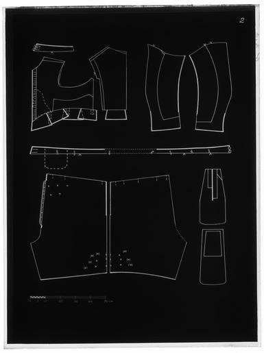 | Keywords: Tröja av sämskskinn. Förmodligen tillverkad av Jehan Beranger, Stockholm - Livrustkammaren - 51599-negative.tif LSH artwork Friderich Feuerbrun pärlstickare Jehan Johan Beranger brodör sv Tröjan av sämskat skinn som tydligen parfymerats av s k innocenttyp med svängd midjelinje 10 skört ståndkrage och relativt korta ärmar med öppna sömmar framtill På grund av det ganska stela och styva materialet eller av att man begagnat sig av ett något urvuxet plagg har man försett det med diverse kilar och tillskarvade stycken Tydligen har man broderat de tillskurna bitarna innan de sedan fogats samman Broderiet är av något annan karaktär än kasackens och byxornas som däremot sinsemellan förefalla likartade I tröjan kan man spåra mer av stramhet Broderiet har sytts icke blott genom lädret utan också genom ett relativt grovt lärftsfoder 17x17 tr/cm2 som lagts mot lädrets insida <br/>Broderiet utgörs även här av en bård Den upptar egentligen ett strängt stiliserat mönster av 16 cm höjd och har nertill vid ytterkanterna begränsats av en repstav och härovanför av en bård som innehåller delar av vad man skulle vilja kalla lambrequinmotiv lagt med repstav Ovanför denna bård följer kompositioner med fruktkorgsmotiv samt palmettarrangering helt symmetriska Allra överst komma dock tulpanliknande blommor som böja sig varannan gång åt höger varannan gång åt vänster Rakt ovanför lambrequinmotivet sitter en liten symmetrisk 7-bladig palmett <br/>Anmärkningsvärt är att man tydligen på tröjan sedan de broderade läderstyckena monterats broderat små kantiljer utanför sömmen d v s i mönstrets fortsättning på det andra läderstycket På ärmarna har man t o m broderat ett ca 4 á 5 cm brett parti i något klumpigare utförande på det nedersta ärmstycket Här kan observeras att man genomgående glömt att göra stycket spegelvänt i förhållande till den intilliggande fruktkorgen Mönstret är för övrigt otroligt väl anpassat till bårdens bredd så att dess proportioner växla på det mest följsamma sätt Lädrets sömmar är hopkastade från baksidan med ca 6stygn/cm samt åt motsatt håll med ca 2 långa kaststygn sytt med 2-trådig högertvinnad grå lintråd I själva broderiet som sytts genom läder och linnefoder har man t ex tagit 9 stygn på en sträcka av 1 cm längd när man sytt ner paljettsträngen Man har använt olikfärgat silke grått gult brunt - med mellannyanser - samt rosa och halmgult <br/>Ett speciellt påpekande bör göras angående skörtens broderier Här har man nämligen förminskat mönstret till mindre rapport och endast broderat små blommor och ornament men likväl behållit lambrequinbården som även den förminskats Man kan lägga märke till delsatt när den 4 5 cm breda spetsen som sytts på skörtens 3 fria sidor denna sitter så långt in på broderiet att lambrequinbården helt döljs dels att man genomgående klippt fodertyget brokaden på baksidan något större än det broderade läderskörtet Dessutom har man på vänstra sidans främsta skört klippt av dess bakre sida vertikalt mitt i broderiet - man har tydligen från början broderat på ett alltför stort skörtstycke Blott en del skört har fått det yttersta snoddbandet som ingår i dekoren placerat på de 3 yttersidorna <br/>Kragen har broderier endast på höger sida ca 9 cm från framkanten räknat På vänster sida går däremot dessa ej ut från kanten utan ca 1 5 cm därifrån och omkring 8 cm åt sidan Det är en ståndkrage med ett 60-tal vertikala avsyningar över de 2 i det grova lärftsfodret 19x18 tr/cm2 horisontellt inlagda lång fiskbenen Dess söm bak ligger inte helt i mitten utan någon cm mer åt höger Upptill är den kantad med ett numera mycket trasigt grått ripsband och har haft vitt taftfoder på insidan Längs den raka framkanten knäpps tröjan med 22 st knappar ca 1 2 cm i diameter varav den 6 e uppifrån saknas Dessutom finns i ståndkragen 3 knappar av samma sort och lika många tränsar av guld- och silvertråd Ärmarna saknar nertill vid uppslagen knappar och knapphål och skiljer sig härigenom från flertalet tröjor <br/>På det högra framstycket där knapparna sitter finns en ca 4 5 cm bred knypplad guld- och silverspets med inlagda breda silverlan som nedifrån skörtets yttersta spets och uppåt räknat når till en höjd av 25 cm Härovanför vidtar en betydligt smalare spets blott 2 8cm bred Detta arrangemang verkar vara ursprungligt då man kan finna liknande tillvägagångssätt på andra tröjor På den knapphålsförsedda vänstra sidan saknas spets helt Placeringen av den breda spetsen tyder på att plagget blott skulle vara knäppt t o m det 12 e eller 13 e knapphålet uppifrån räknat Numera kan man göra den iakttagelsen att just dessa knapphål slitits vilket visserligen även skett med det 20 e som dock kantänkas härröra från tidigare utställning <br/>I övrigt har den breda spetsen tydligen suttit runt omkring alla skört Varje skört drar ca 40 cm vid de öppna ärmsömmarna i de öppna ärmuppslagens insidor runt ärmsömmarna på axelsömmarna och 38 cm på vänster framstycke och eventuellt även på kragen Numera finns spetsarna uteslutande kvar på 1 a skörtet på höger sida skörten mitt bak samt det 3 e på vänster sida i bägge ärmarnas långa sprund i ärmuppslaget på vänster ärm runt höger ärm samt vid nedre delen av vänster ärmringning på höger axel och den redan nämnda biten på höger framstycke I midjesömmen under skörten sitter på insidan 6 st byxtampar försedda med vardera 2 hål Den mellersta på höger sida är troligen senare ditsydd eftersom den är klädd med en glesare vävnad med mörkare guldlan De övriga är - som brukligt är - sydda av foderbrokaden <br/>Tröjan är fodrad med s k gyllenduk d v s guldbrokad Den har en vådbredd av minst 50 cm utan stad ca 70x20 tr/cm2 med varp av otvinnat vitt silke Inslaget bildas av tjockare vitt silk