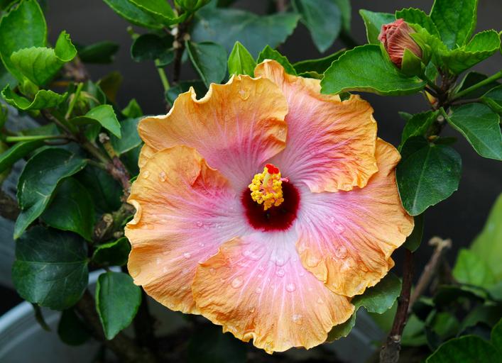 Keywords: tropical hibiscus bahama bay rum runner flower morning rain drops garden fresh spring summer blossom bloom petals pastels plant shrub perennial dew