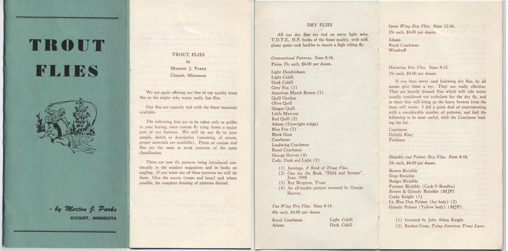 Keywords: TroutFliesMertonParksc1950.jpg en Composite of pages from a fly tying catalog Trout Flies by Merton J Parks Cloquet MN circa 1950 Scanned from original copy of Trout Flies catalog by Merton J Parks circa 1950 Merton J Parks ca 1950 Scanned and released into the public domain with the expressed permission of Richard Parks son of Merton Parks richard parksflyshop com PD-heirs Trout fly patterns |