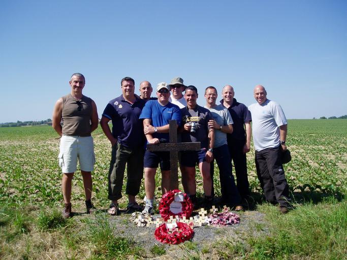 Keywords: Truce.gang.jpg en Christmas Truce Field nr Ypres from left to right Steve Williams Dave Woodall Mark Nicholson Terry Melia Stu Smith Neil Watson Graham Smith Andy Springthorpe Andy Stange own The Woodmiester 2006-06-10 Christmas Truce 1914 Ypres