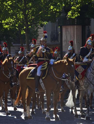 Keywords: trumpet fanfare staff captain cavalry regiment republican guard paris france summer equestrian patrol helmet honor horse military