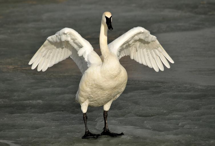 Keywords: trumpeter swan bird wildlife nature wild waterfowl cygnus wings flight outdoors flapping spread fowl reeds waterbird white standing