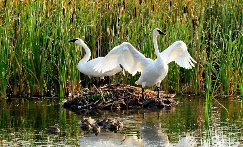 Keywords: trumpeter swans birds wildlife nature water nest wings outdoors lake waterfowl white cygnus reeds