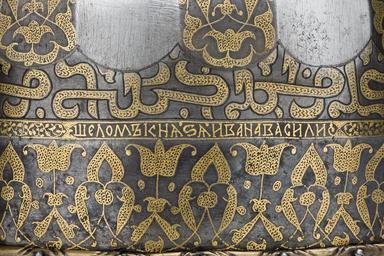 | Keywords: Tsar Ivans hjälm. Detalj på en av de 4 textrader som löper runt hjälmen - Livrustkammaren - 87048.tif  LSH artwork uk Шолом московського князя Івана Васильовича 1533  ік en The helmet of a Muscovy Ivan the Terrible 1533 Spetsig hjälm av stål med påslagen gulddekor Nertill en ca 35 mm bred rand med symmetrisk rankdekor där blommor och blad är täckta av små guldbågar Därovanför ett 5 mm brett band med guldkanter och rankdekor där bladen är helt av guld I bandet är utsparade fält med spetsiga ändar vartannat med bladrankor vartannat med gammalrysk guldtext fyra textfält Hjälm som tillhört furst Ivan Vasiljevitj son till storfursten Vasilij Ivanovitj herre och hela Rysslands självhärskare Därovanför ett band b 20-25 mm med arabisk-liknande skrifttecken med breda staplar med påslagna guldbågar och breda punsade kantlinjer urspr täckta av silver Därovanför uppåt avsmalnande fält med bågformig avslutning nertill i form av en påslagen silverlinje vartannat fält blankt vartannat med bladrankor av guld Hjälmklockan avslutad upptill med ett band b 25 mm med bladrankor <br/>Längs nederkanten fastnitat med nitar med kulformiga huvuden en något profilerad rundad mässingslist listen saknas på tre ställen Upptill en konisk spets l 108 avslutad med en snedräfflad kula på spetsen nertill övre delen av klockans rankdekor därovanför ett band med rankdekor b 15 mm Övre dleen av spetsen schackrutig med långa rektangulära blanka och rankdekorerade fält dekoren delvis utsliten Spetsen är fastnitad på platta som förts upp i hjälmklockan underifrån men är nu rörlig runt aeln original caption Tsar Ivans hjälm Detalj på en av de 4 textrader som löper runt hjälmen LRK 20389<br/> Nyckelord Detalj Hjälm Tsar Ivan IV Blankvapen Föremålsbild Erövringen av Warszawa Stora oredan<br/> Stora oredan Moskwa Slaget vid Lode ca 1533 steel - silver - brass - gold g 1180 size mm 190 minsta size mm 190 största size mm 380 LRK Ivan IV av Ryssland tsar Basutställning utställning i Moskwa 1965 Moskwa Livrustkammarens basutställning 1978 Gustav II Adolf 350 år efter Lützen 1982-1984 Islamiskt i de kungliga samlingarna 1984 Kungens lockpipa 1995-1996 Karl XII och Peter den store 1998-1999 The Moscow Kremlin Reflected in its 800-Years History 2004 Der Kreml Gottesruhm u Zarenpracht 2004 From Tsar to Emperor Moscow - Saint Petersburg 2005-2006 Art of Ivan the Terrible's Age arbets- namn 2007-2008 Krigsbyte 2007-2008 State Museum of the Moscow Kremlin + Astrakhan Historico-Architectural Museum 2009 Sainte Russie de la Rus  de Kiev à la Russie de Pierre le Grand Louvren 2010 Ryssland och Sverige under 1600-talet Basutställning place of origin original filename lm_dig4687_20389 56957 inventory number LRK 20389 87048 CC-BY-SA Jens Mohr <gallery caption Different images of same object > File Tsar Ivans hjälm Detalj på en av de 4 textrader som löper runt hjälmen - Livrustkammaren - 87049 tif File Detalj tsar Ivans hjälm - Livrustkammaren - 8870 tif File Hjälm Oruzejnaja Palata Moskva ca 1533 - Livrustkammaren - 17456 tif File Tsar Ivans hjälm - Livrustkammaren - 87045 tif File Detalj tsar Ivans hjälm - Livrustkammaren - 311 tif File Tsar Ivans hjälm - Livrustkammaren - 87046 tif File Tsar Ivans hjälm - Livrustkammaren - 3 tif File Tsar Ivans hjälm Detalj på en av de 4 textrader som löper runt hjälmen - Livrustkammaren - 87050 tif File Tsar Ivans hjälm Detalj på en av de 4 textrader som löper runt hjälmen - Livrustkammaren - 87047 tif </gallery> Jens Mohr Russian medieval helmets Military helmet images from Livrustkammaren Color images from Livrustkammaren Media contributed by LSH unmatched event Media contributed by LSH dim-with multiple size templates Media contributed by LSH unmatched keyword Media contributed by LSH 2013-10 |