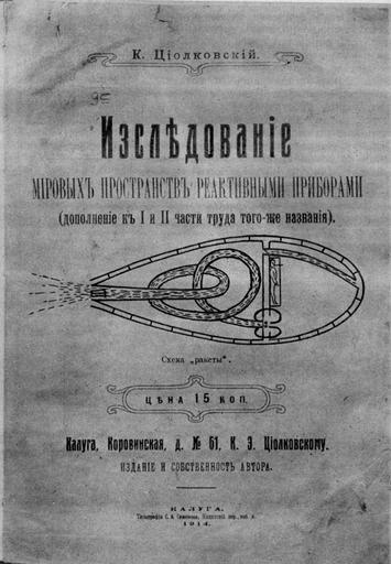 | Keywords: Tsiolk152.jpg en Обложка книги К Э Циолковского «Исследование ми овых п ост анств еактивными п ибо ами» изданная в Калуге в 1914 году http //www testpilot ru/espace/bibl/volkov/v-poiskah/01 html tsiokovki 1914 PD-RusEmpire Books by Konstantin Tsiolkovsky |
