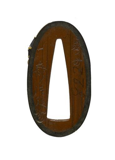| Keywords: Tsuchiya Takechika - Fuchi with Travelers' Accessories - Walters 511008 - Mark A.jpg This fuchi depicts a walking stick and a wicker backpack These items were often carried by traveling monks 3rd quarter 19th century late Edo-Meiji shibuichi gold cm 3 7 accession number 51 1008 23536 William T / Henry Walters Collection Baltimore date and mode of acquisition unknown Walters Art Museum Henry Walters Acquired by William T or Henry Walters Signature Issai Hogen kao place of origin Edo present-day Tokyo Japan Walters Art Museum license Tosogu Japanese sword fittings in the Walters Art Museum Tsuchiya Takechika Media contributed by the Walters Art Museum needs category review Media contributed by the Walters Art Museum needs artist update |
