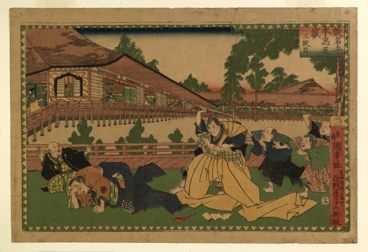 | Keywords: Tsujiokaya Kamekichi - Kanadehon chushingura - Walters 95114.jpg The evil Moronao continues to insult Lord Enya Hangan Supposing I meant what I said what would you do about it Just this cries Hangan slashing Moronao between the eyebrows with his sword A retainer rushes in grabbing Hangan from behind and restraining him between 1854-12 1855-01 late Edo pigments mulberry paper cm 25 5 38 accession number 95 114 36304 Justine Lewis Keidel date and mode of acquisition unknown Walters Art Museum Gift of Justine Lewis Keidel 1986 Signature Ichiyūsai Kuniyoshi ga; Date Seal Tora jūichi; Date Seal Translation Tiger 11 December 1854 - January 1855 The Nature of Loyalty Japanese Warrior Prints of the Nineteenth Century The Walters Art Gallery Baltimore 1989 place of origin Japan Walters Art Museum license 2D Japanese prints in the Walters Art Museum Historic samurai prints Media contributed by the Walters Art Museum needs category review Utagawa Kuniyoshi |