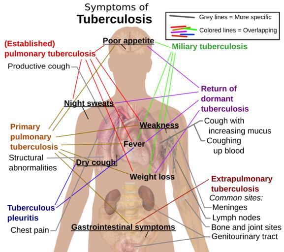 | Keywords: Tuberculosis symptoms.svg en Main symptoms of different variants and stages of tuberculosis See Wikipedia Tuberculosis with many symptoms overlapping with other variants while others are more but not entirely specific for certain variants Multiple variants may be present simultaneously <P>To discuss image please see Template talk Human body diagrams <P>References http //www emedicinehealth com/tuberculosis/page3_em htm Tuberculosis Symptoms From eMedicineHealth Author George Schiffman MD FCCP Last Editorial Review 1/15/2009 Additional symptoms for primary/early pulmonary infection http //www wrongdiagnosis com/t/tuberculosis/symptoms htm wrongdiagnosis com --> Diseases » Tuberculosis » Symptoms Retrieved on June 1 2009 All used images are in public domain Mikael Häggström gallery of 2014 2009-06-01 Tuberculosis symptoms versions See also <gallery class nochecker > File Pulmonary tuberculosis symptoms svg Pulmonary tuberculosis symptoms File Extrapulmonary tuberculosis symptoms svg Extrapulmonary tuberculosis symptoms </gallery> Human body diagrams Tuberculosis SVG diagrams of the adult male human body by Mikael Häggström |