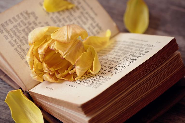 Keywords: tulip flower yellow orange blossom bloom petals book book pages font close