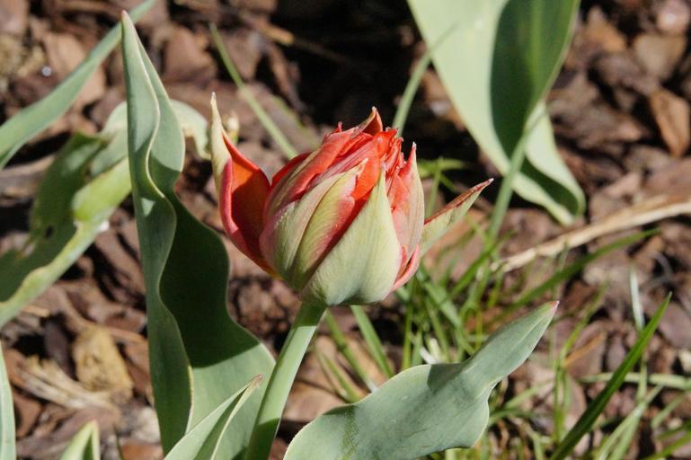 Keywords: tulip red bloom flower spring nature blossom bloom plant garden bud bursting popping up at the beginning start