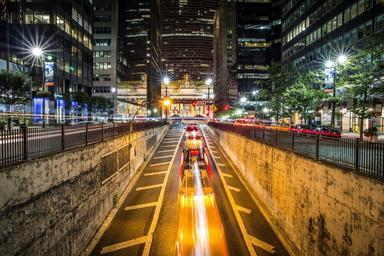 Keywords: tunnel exit night street road traffic cars illumination street lights urban city downtown modern motion long exposure busy transportation