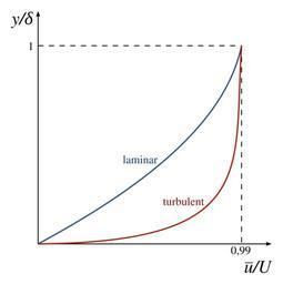 Keywords: Turbulent laminar boundary layer profiles.svg en A comparison of the velocity profiles of two boundary layers; in the turbulent case only the time-average of the profile is shown 2015-04 own Olivier Cleynen other versions cc-zero SVG physics Uploaded with UploadWizard Boundary layer |