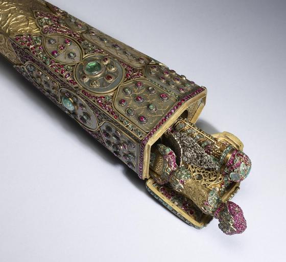 Keywords: Turkish - Rifle - Walters 5184 - Detail A.jpg Referencing the elite pastimes of hunting and writing this ceremonial jeweled rifle set includes a dagger pen case penholder with pen penknife cleaner and a spoon-all conveniently housed within the rifle butt Penknives were important elements in the calligrapher's toolset and their handles were often elaborately decorated The hardness of the reed used for pens throughout Islamic lands required a good blade to make a clean cut The small spoon was used to put black powder into the flash pan in preparation for firing the rifle The imperial monogram tughra of the Ottoman ruler Sultan Mahmud I r 1730-54 is inscribed in diamonds inside the hinged panel of the rifle butt The artist Muhammad and the rifle's owner Ahmad Khan who had possession of the rifle at some point are also named 1732-33 Early Modern rifle steel wood gold gilded silver gilded brass silver nephrite diamonds emeralds rubies or spinels ; dagger steel inlaid with gold rubies and beryls cm 24 8 139 7 7 accession number 51 84 22655 R S Pardo Constantinople date and mode of acquisition unknown Henry Walters Baltimore 1903 mode of acquisition unknown Walters Art Museum Henry Walters Acquired by Henry Walters 1903 Translation on barrel What God wills on flintlock Work of Muhammad; its owner is Ahmad Khan tughra hidden under panel in stock is that of Sultan Mahmud I r 1730-1754 place of origin Turkey Walters Art Museum license Islamic metalwork in the Walters Art Museum Weapons in the Walters Art Museum Firearms of the Ottoman Empire Art from Turkey Media contributed by the Walters Art Museum needs category review |