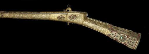 Keywords: Turkish - Rifle - Walters 5184 - Detail A (2) (3).jpg Referencing the elite pastimes of hunting and writing this ceremonial jeweled rifle set includes a dagger pen case penholder with pen penknife cleaner and a spoon-all conveniently housed within the rifle butt Penknives were important elements in the calligrapher's toolset and their handles were often elaborately decorated The hardness of the reed used for pens throughout Islamic lands required a good blade to make a clean cut The small spoon was used to put black powder into the flash pan in preparation for firing the rifle The imperial monogram tughra of the Ottoman ruler Sultan Mahmud I r 1730-54 is inscribed in diamonds inside the hinged panel of the rifle butt The artist Muhammad and the rifle's owner Ahmad Khan who had possession of the rifle at some point are also named 1732-33 Early Modern rifle steel wood gold gilded silver gilded brass silver nephrite diamonds emeralds rubies or spinels ; dagger steel inlaid with gold rubies and beryls cm 24 8 139 7 7 accession number 51 84 22655 R S Pardo Constantinople date and mode of acquisition unknown Henry Walters Baltimore 1903 mode of acquisition unknown Walters Art Museum Henry Walters Acquired by Henry Walters 1903 Translation on barrel What God wills on flintlock Work of Muhammad; its owner is Ahmad Khan tughra hidden under panel in stock is that of Sultan Mahmud I r 1730-1754 place of origin Turkey <gallery> File Turkish - Rifle - Walters 5184 - Detail A jpg File Turkish - Rifle - Walters 5184 - Detail A 2 jpg </gallery> Walters Art Museum license Tüfeks Islamic metalwork in the Walters Art Museum Weapons in the Walters Art Museum Art from Turkey |