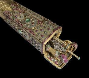 Keywords: Turkish - Rifle - Walters 5184 - Detail C (2) (3).jpg Referencing the elite pastimes of hunting and writing this ceremonial jeweled rifle set includes a dagger pen case penholder with pen penknife cleaner and a spoon-all conveniently housed within the rifle butt Penknives were important elements in the calligrapher's toolset and their handles were often elaborately decorated The hardness of the reed used for pens throughout Islamic lands required a good blade to make a clean cut The small spoon was used to put black powder into the flash pan in preparation for firing the rifle The imperial monogram tughra of the Ottoman ruler Sultan Mahmud I r 1730-54 is inscribed in diamonds inside the hinged panel of the rifle butt The artist Muhammad and the rifle's owner Ahmad Khan who had possession of the rifle at some point are also named 1732-33 Early Modern rifle steel wood gold gilded silver gilded brass silver nephrite diamonds emeralds rubies or spinels ; dagger steel inlaid with gold rubies and beryls cm 24 8 139 7 7 accession number 51 84 22655 R S Pardo Constantinople date and mode of acquisition unknown Henry Walters Baltimore 1903 mode of acquisition unknown Walters Art Museum Henry Walters Acquired by Henry Walters 1903 Translation on barrel What God wills on flintlock Work of Muhammad; its owner is Ahmad Khan tughra hidden under panel in stock is that of Sultan Mahmud I r 1730-1754 place of origin Turkey <gallery> File Turkish - Rifle - Walters 5184 - Detail C jpg File Turkish - Rifle - Walters 5184 - Detail C 2 jpg </gallery> Walters Art Museum license Islamic metalwork in the Walters Art Museum Weapons in the Walters Art Museum Firearms of the Ottoman Empire Art from Turkey Media contributed by the Walters Art Museum needs category review |