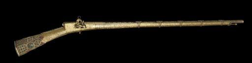 Keywords: Turkish - Rifle - Walters 5184 - Side B.jpg Referencing the elite pastimes of hunting and writing this ceremonial jeweled rifle set includes a dagger pen case penholder with pen penknife cleaner and a spoon-all conveniently housed within the rifle butt Penknives were important elements in the calligrapher's toolset and their handles were often elaborately decorated The hardness of the reed used for pens throughout Islamic lands required a good blade to make a clean cut The small spoon was used to put black powder into the flash pan in preparation for firing the rifle The imperial monogram tughra of the Ottoman ruler Sultan Mahmud I r 1730-54 is inscribed in diamonds inside the hinged panel of the rifle butt The artist Muhammad and the rifle's owner Ahmad Khan who had possession of the rifle at some point are also named 1732-33 Early Modern rifle steel wood gold gilded silver gilded brass silver nephrite diamonds emeralds rubies or spinels ; dagger steel inlaid with gold rubies and beryls cm 24 8 139 7 7 accession number 51 84 22655 R S Pardo Constantinople date and mode of acquisition unknown Henry Walters Baltimore 1903 mode of acquisition unknown Walters Art Museum Henry Walters Acquired by Henry Walters 1903 Translation on barrel What God wills on flintlock Work of Muhammad; its owner is Ahmad Khan tughra hidden under panel in stock is that of Sultan Mahmud I r 1730-1754 place of origin Turkey Walters Art Museum license Tüfeks Firearms of the Ottoman Empire Islamic metalwork in the Walters Art Museum Weapons in the Walters Art Museum Art from Turkey |