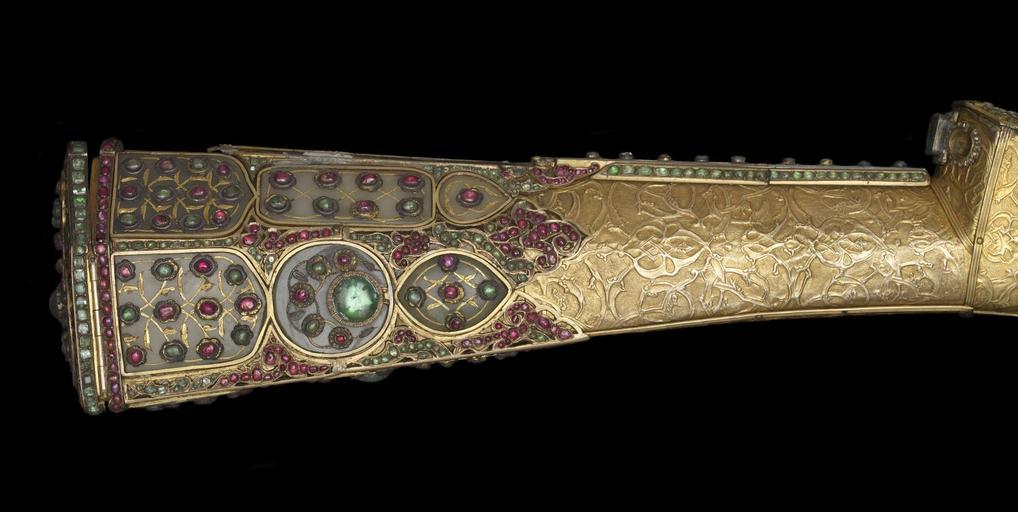 Keywords: Turkish - Rifle - Walters 5184 - Detail C.jpg Referencing the elite pastimes of hunting and writing this ceremonial jeweled rifle set includes a dagger pen case penholder with pen penknife cleaner and a spoon-all conveniently housed within the rifle butt Penknives were important elements in the calligrapher's toolset and their handles were often elaborately decorated The hardness of the reed used for pens throughout Islamic lands required a good blade to make a clean cut The small spoon was used to put black powder into the flash pan in preparation for firing the rifle The imperial monogram tughra of the Ottoman ruler Sultan Mahmud I r 1730-54 is inscribed in diamonds inside the hinged panel of the rifle butt The artist Muhammad and the rifle's owner Ahmad Khan who had possession of the rifle at some point are also named 1732-33 Early Modern rifle steel wood gold gilded silver gilded brass silver nephrite diamonds emeralds rubies or spinels ; dagger steel inlaid with gold rubies and beryls cm 24 8 139 7 7 accession number 51 84 22655 R S Pardo Constantinople date and mode of acquisition unknown Henry Walters Baltimore 1903 mode of acquisition unknown Walters Art Museum Henry Walters Acquired by Henry Walters 1903 Translation on barrel What God wills on flintlock Work of Muhammad; its owner is Ahmad Khan tughra hidden under panel in stock is that of Sultan Mahmud I r 1730-1754 place of origin Turkey Walters Art Museum license Islamic metalwork in the Walters Art Museum Weapons in the Walters Art Museum Firearms of the Ottoman Empire Art from Turkey Media contributed by the Walters Art Museum needs category review |