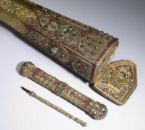 Keywords: Turkish - Rifle - Walters 5184 - Detail C (2).jpg Referencing the elite pastimes of hunting and writing this ceremonial jeweled rifle set includes a dagger pen case penholder with pen penknife cleaner and a spoon-all conveniently housed within the rifle butt Penknives were important elements in the calligrapher's toolset and their handles were often elaborately decorated The hardness of the reed used for pens throughout Islamic lands required a good blade to make a clean cut The small spoon was used to put black powder into the flash pan in preparation for firing the rifle The imperial monogram tughra of the Ottoman ruler Sultan Mahmud I r 1730-54 is inscribed in diamonds inside the hinged panel of the rifle butt The artist Muhammad and the rifle's owner Ahmad Khan who had possession of the rifle at some point are also named 1732-33 Early Modern rifle steel wood gold gilded silver gilded brass silver nephrite diamonds emeralds rubies or spinels ; dagger steel inlaid with gold rubies and beryls cm 24 8 139 7 7 accession number 51 84 22655 R S Pardo Constantinople date and mode of acquisition unknown Henry Walters Baltimore 1903 mode of acquisition unknown Walters Art Museum Henry Walters Acquired by Henry Walters 1903 Translation on barrel What God wills on flintlock Work of Muhammad; its owner is Ahmad Khan tughra hidden under panel in stock is that of Sultan Mahmud I r 1730-1754 place of origin Turkey <gallery> File Turkish - Rifle - Walters 5184 - Detail C jpg </gallery> Walters Art Museum license Islamic metalwork in the Walters Art Museum Weapons in the Walters Art Museum Firearms of the Ottoman Empire Art from Turkey Media contributed by the Walters Art Museum needs category review |