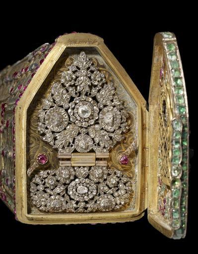 Keywords: Turkish - Rifle - Walters 5184 - Detail H.jpg Referencing the elite pastimes of hunting and writing this ceremonial jeweled rifle set includes a dagger pen case penholder with pen penknife cleaner and a spoon-all conveniently housed within the rifle butt Penknives were important elements in the calligrapher's toolset and their handles were often elaborately decorated The hardness of the reed used for pens throughout Islamic lands required a good blade to make a clean cut The small spoon was used to put black powder into the flash pan in preparation for firing the rifle The imperial monogram tughra of the Ottoman ruler Sultan Mahmud I r 1730-54 is inscribed in diamonds inside the hinged panel of the rifle butt The artist Muhammad and the rifle's owner Ahmad Khan who had possession of the rifle at some point are also named 1732-33 Early Modern rifle steel wood gold gilded silver gilded brass silver nephrite diamonds emeralds rubies or spinels ; dagger steel inlaid with gold rubies and beryls cm 24 8 139 7 7 accession number 51 84 22655 R S Pardo Constantinople date and mode of acquisition unknown Henry Walters Baltimore 1903 mode of acquisition unknown Walters Art Museum Henry Walters Acquired by Henry Walters 1903 Translation on barrel What God wills on flintlock Work of Muhammad; its owner is Ahmad Khan tughra hidden under panel in stock is that of Sultan Mahmud I r 1730-1754 place of origin Turkey Walters Art Museum license Islamic metalwork in the Walters Art Museum Weapons in the Walters Art Museum Firearms of the Ottoman Empire Art from Turkey Media contributed by the Walters Art Museum needs category review