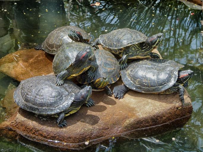 Keywords: turtles rock stream water pond together nature outside cute