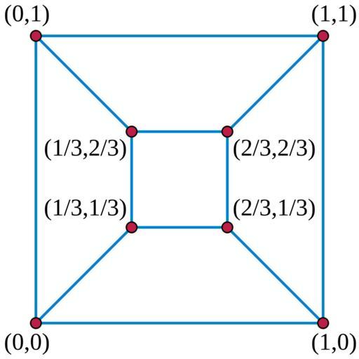 | Keywords: Tutte cube.svg Tutte embedding of the graph of a cube The outer four vertices are fixed at the corners of a unit square and each remaining vertex is at the average of its neighbors' positions 2013-05-28 17 47 33 own David Eppstein cc-zero Uploaded with UploadWizard Undirected planar graphs |