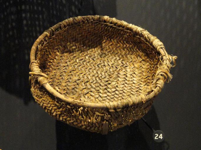 | Keywords: Twill-plaited ring basket, 900-1100 AD, Kayenta Anasazi, Priestess Cave, Arizona, yucca leaves - Natural History Museum of Utah - DSC07313.JPG en Exhibit in the Natural History Museum of Utah Salt Lake City Utah USA This item is old enough so that it is in the public domain Photography was permitted in the museum without restriction 2013-03-17 14 58 51 own Daderot cc-zero Uploaded with UploadWizard Anasazi basketry in the Natural History Museum of Utah | ||||