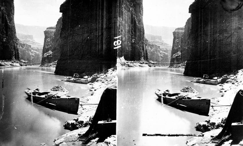 Keywords: stereoscopic stereophotography stereophotographs historical usgs history geology mapping black and white blackandwhite bnw stereograph blackandwhite monochrome outdoor black and white Two boats in Marble Canyon, Colorado River. Major Powell's armchair in on one of the boats. Grand Canyon National Park. Coconino County, Arizona. 1872. (Stereoscopic view) Two boats in Marble Canyon, Colorado River. Major Powell's armchair in on one of the boats. Grand Canyon National Park. Coconino County, Arizona. 1872. (Stereoscopic view)
