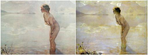 Keywords: Two September Morns.jpg en Comparison of a 1961 reproduction of September Morn with an auto-adjusted version of the MET's digitization For a FPC discussion 1912 Left image http //hoaxes org/archive/permalink/the_september_morn_hoax The Museum of Hoaxes appears to be scanned from a 1961 book Right image File Paul Chabas September Morn The Metropolitan Museum of Art jpg Creator Paul Émile Chabas other versions Custom license marker 2014 09 24 PD-old-auto-1923 1937 Uploaded with UploadWizard Paintings uploaded by Chris Woodrich September Morn |