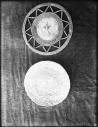 Photograph of a collection of 2 unidentified Indian baskets on display, photographed ca.1900. They are displayed against a dark cloth. One is flat and disk-shaped with a spiral weave. The other is more ornate, having the image of a twig with three leaves in the middle and openings around a zig-zag pattern surrounding the central portion.