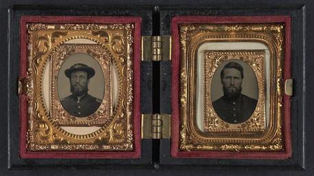 Keywords: library of congress libraryofcongress dc:identifier=http://hdl.loc.gov/loc.pnp/ppmsca.27456 dc:identifier=httphdllocgovlocpnpppmsca27456 xmlns:dc=http://purl.org/dc/elements/1.1/ xmlns:dc=httppurlorgdcelements11 u.s. civil war uscivilwar american civil war americancivilwar the civil war thecivilwar civil war civilwar war between the states warbetweenthestates united states of america unitedstatesofamerica u.s.a. usa the union theunion union the north thenorth yankee yankees soldier soldiers people groupshot architecture door picture frame photo border indoor [Two unidentified soldiers in Union uniforms] [between 1861 and 1865] 2 photographs in 1 case : gem tintype, hand-colored ; 5.4 x 4.8 cm (case) Notes: Title devised by Library staff. Case: Berg, no. Berg 1-178. Gift; Tom Liljenquist; 2010; (DLC/PP-2010:105). Subjects: United States.--Army.--People--1860-1870. Soldiers--Union--1860-1870. Military uniforms--Union--1860-1870. United States--History--Civil War, 1861-1865--Military personnel--Union. Format: Portrait photographs--1860-1870. Tintypes--Hand-colored--1860-1870. Rights Info: No known restrictions on publication. Repository: Library of Congress, Prints and Photographs Division, Washington, D.C. 20540 USA, hdl.loc.gov/loc.pnp/pp.print Part Of: Ambrotype/Tintype filing series (Library of Congress) (DLC) 2010650518 Liljenquist Family collection (Library of Congress) (DLC) 2010650519 More information about this collection is available at hdl.loc.gov/loc.pnp/pp.lilj Persistent URL: hdl.loc.gov/loc.pnp/ppmsca.27456 Call Number: AMB/TIN no. 2585 [Two unidentified soldiers in Union uniforms] [between 1861 and 1865] 2 photographs in 1 case : gem tintype, hand-colored ; 5.4 x 4.8 cm (case) Notes: Title devised by Library staff. Case: Berg, no. Berg 1-178. Gift; Tom Liljenquist; 2010; (DLC/PP-2010:105). Subjects: United States.--Army.--People--1860-1870. Soldiers--Union--1860-1870. Military uniforms--Union--1860-1870. United States--History--Civil War, 1861-1865--Military personnel--Union. Format: Portrait photographs--1860-1870. Tintypes--Hand-colored--1860-1870. Rights Info: No known restrictions on publication. Repository: Library of Congress, Prints and Photographs Division, Washington, D.C. 20540 USA, hdl.loc.gov/loc.pnp/pp.print Part Of: Ambrotype/Tintype filing series (Library of Congress) (DLC) 2010650518 Liljenquist Family collection (Library of Congress) (DLC) 2010650519 More information about this collection is available at hdl.loc.gov/loc.pnp/pp.lilj Persistent URL: hdl.loc.gov/loc.pnp/ppmsca.27456 Call Number: AMB/TIN no. 2585 |