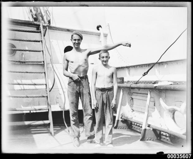 Keywords: samuel j hood collection samueljhoodcollection sailing sailors deck ship harbour scenes harbourscenes boats magdalene vinnen magdalenevinnen german german barque germanbarque barque crew groupshot people blackandwhite monochrome photo border sketch drawing black and white This photograph depicts two young crew members on board the four-masted steel barque MAGDALENE VINNEN. The vessel sailed into Sydney Harbour on 27 February 1933, under the command of Captain Lorenz Peters. The barque was loaded with almost 16,000 bales of wool, the fourth largest shipment to have left Sydney, before it sailed the record-breaking 82-day voyage for Falmouth, England. MAGDALENE VINNEN visited Australia again in 1935, with a cargo of wheat, lifted from Port Broughton in South Australia. This photo is part of the Australian National Maritime Museum’s Samuel J. Hood Studio collection. Sam Hood (1872-1953) was a Sydney photographer with a passion for ships. His 60-year career spanned the romantic age of sail and two world wars. The photos in the collection were taken mainly in Sydney and Newcastle during the first half of the 20th century. The ANMM undertakes research and accepts public comments that enhance the information we hold about images in our collection. This record has been updated accordingly. Photographer: Samuel J. Hood Studio Collection Object no. 00035607 This photograph depicts two young crew members on board the four-masted steel barque MAGDALENE VINNEN. The vessel sailed into Sydney Harbour on 27 February 1933, under the command of Captain Lorenz Peters. The barque was loaded with almost 16,000 bales of wool, the fourth largest shipment to have left Sydney, before it sailed the record-breaking 82-day voyage for Falmouth, England. MAGDALENE VINNEN visited Australia again in 1935, with a cargo of wheat, lifted from Port Broughton in South Australia. This photo is part of the Australian National Maritime Museum’s Samuel J. Hood Studio collection. Sam Hood (1872-1953) was a Sydney photographer with a passion for ships. His 60-year career spanned the romantic age of sail and two world wars. The photos in the collection were taken mainly in Sydney and Newcastle during the first half of the 20th century. The ANMM undertakes research and accepts public comments that enhance the information we hold about images in our collection. This record has been updated accordingly. Photographer: Samuel J. Hood Studio Collection Object no. 00035607